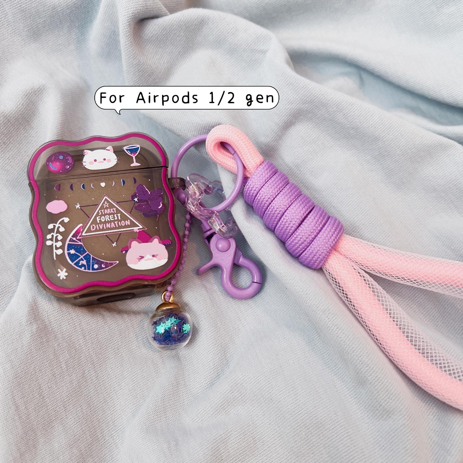 Protect your AirPods in mystical style with this case featuring cute cats and whimsical divination symbols. Printed with vibrant colors that won't fade in water, this soft TPU case adds both charm and durability. Comes with adorable matching keychains and a lanyard for extra flair!
