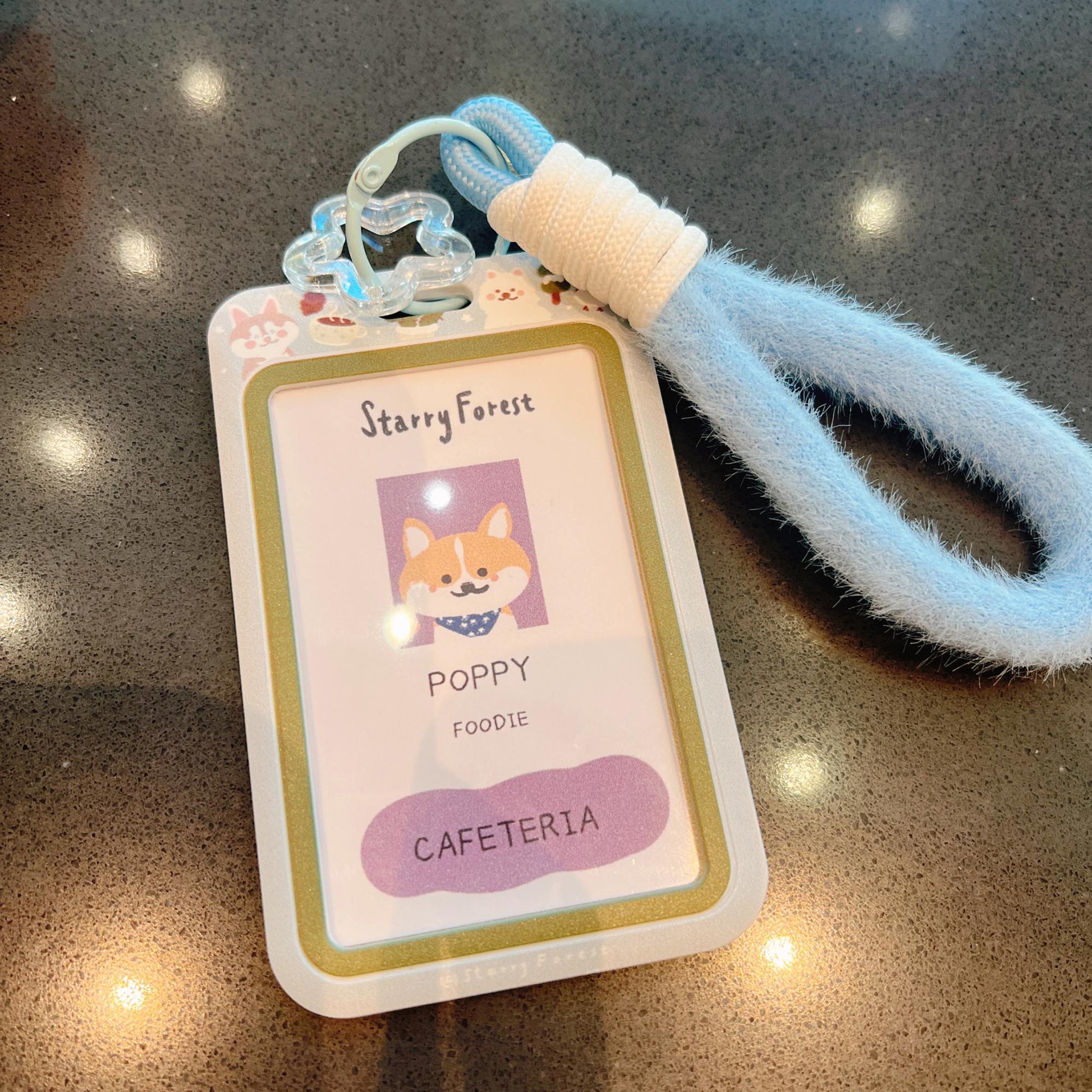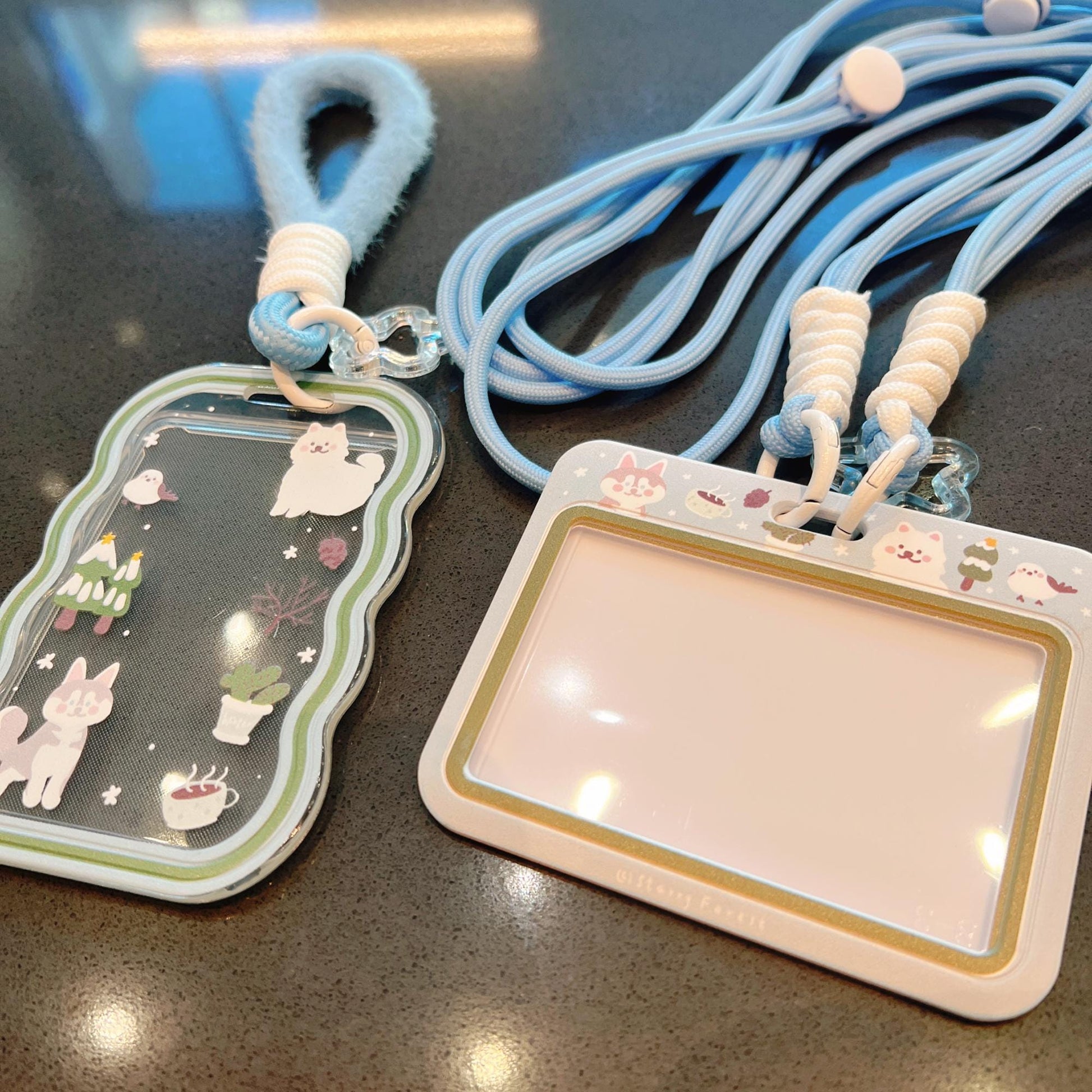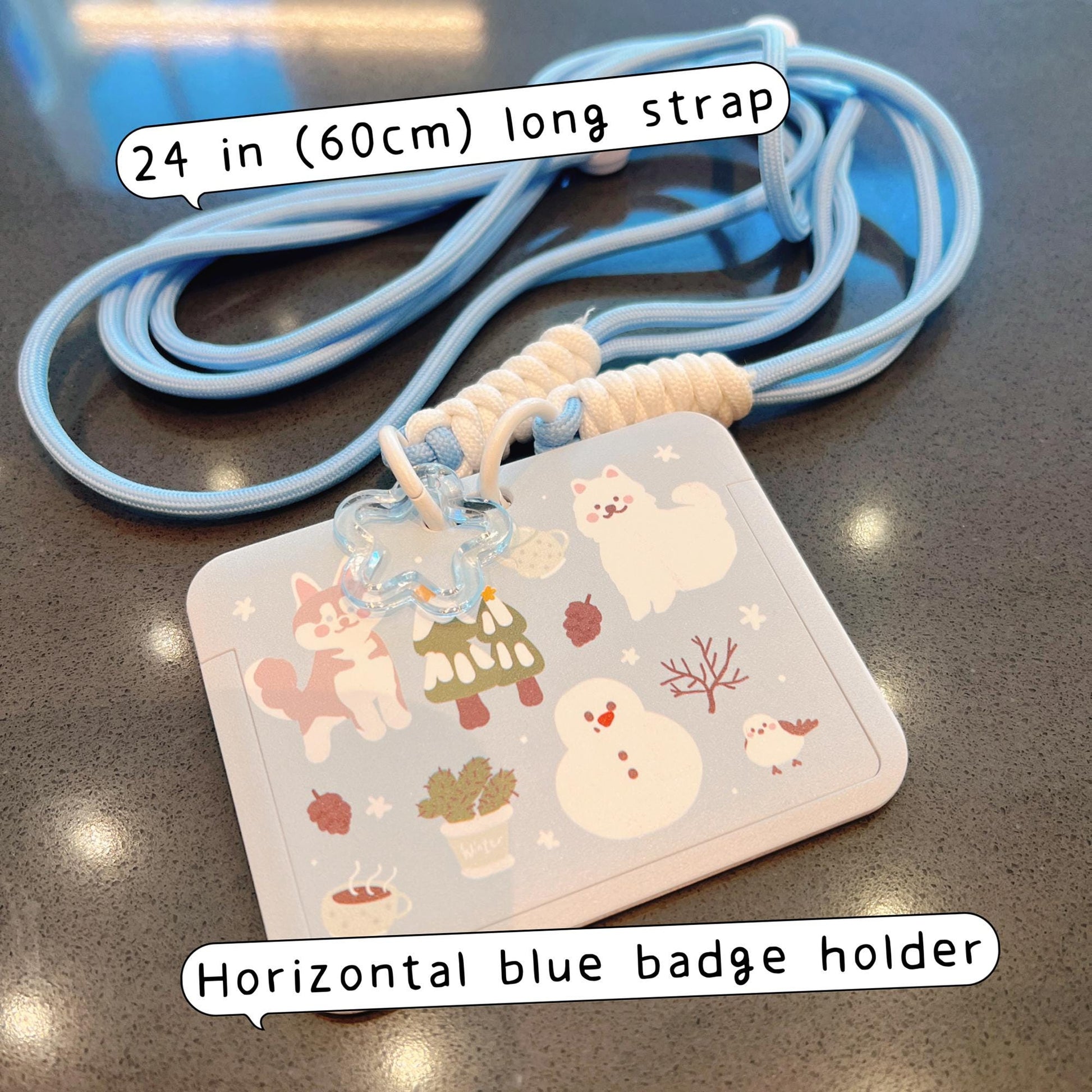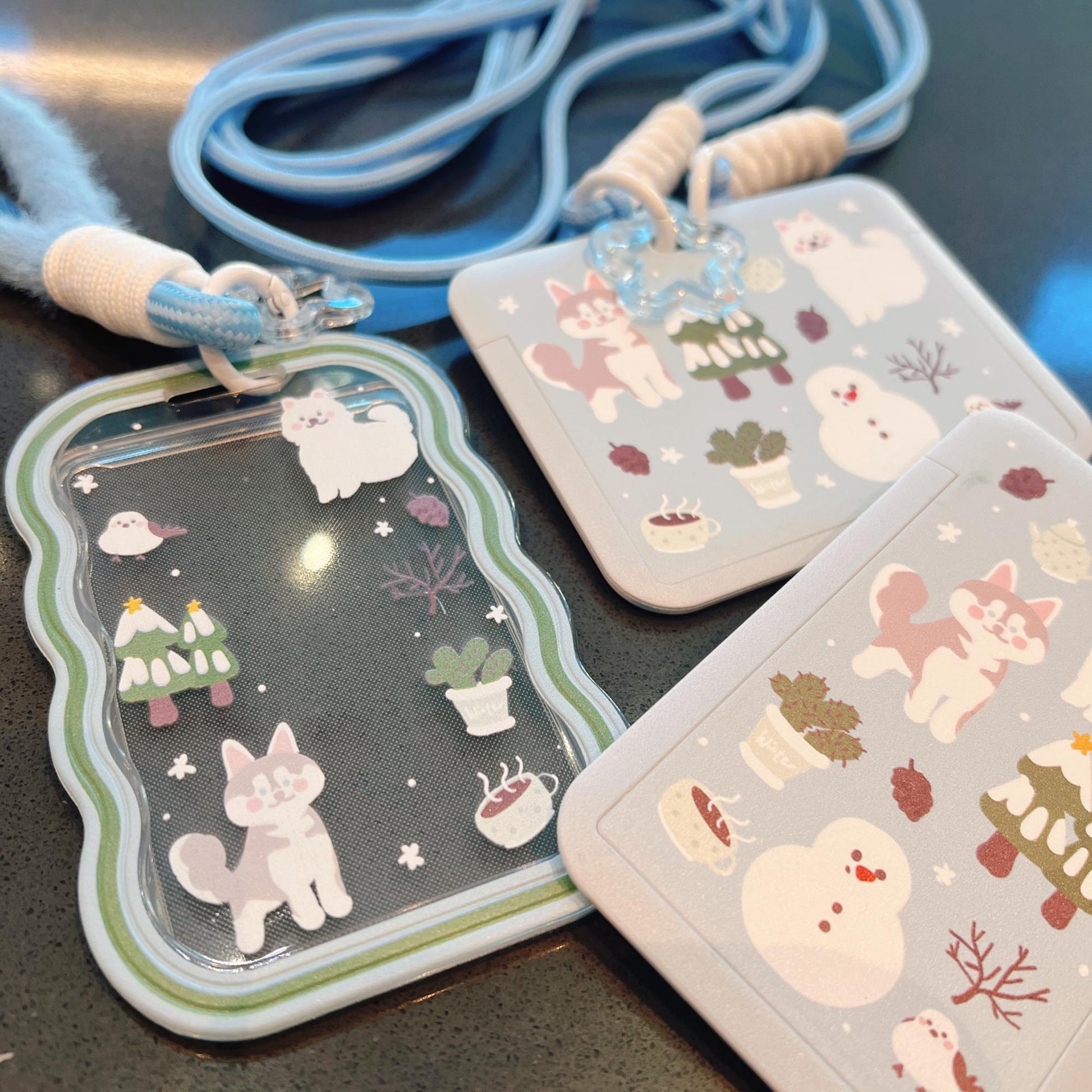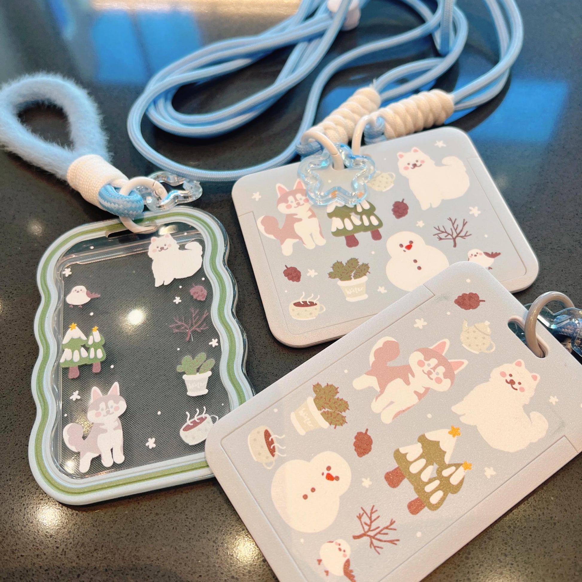 ❄️ Starry Forest Original Design — Cute Husky, Samoyed & Snowman Blue ID Badge Card Holder with Lanyard & Keychain